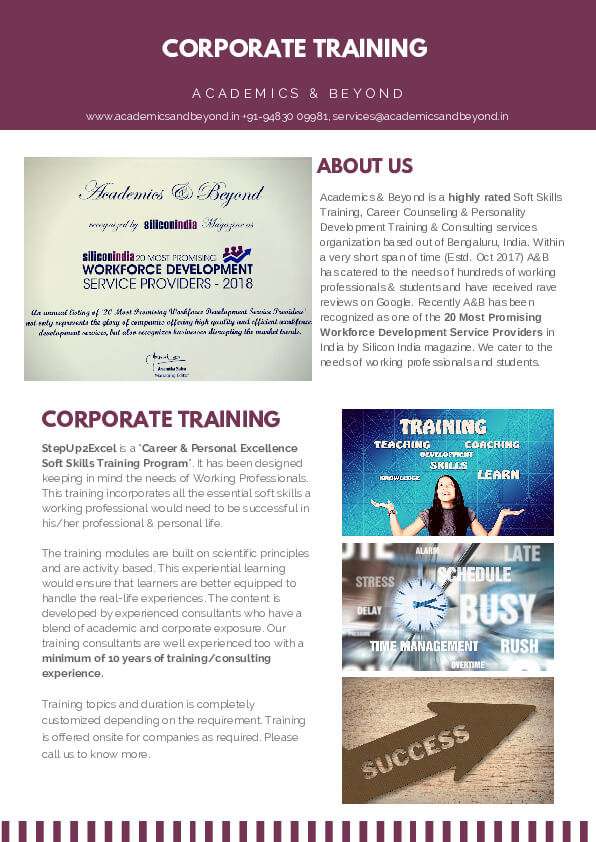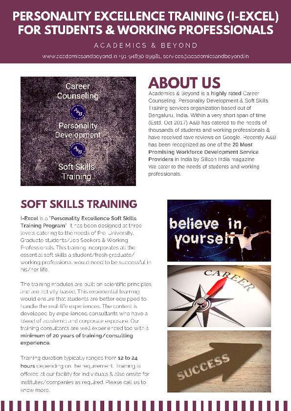Brochures Explore & Download Our Brochures: Discover Solutions for Your Needs Our Services Career Counseling Service StepUp2Excel – Soft Skills Program Corporate training services brochure Select Customer Reviews APEx – Academic & Personality Excellence Program for School Going Students WebinarServices DiscoverMySelf – Personality Analysis Personality Development – I-Excel